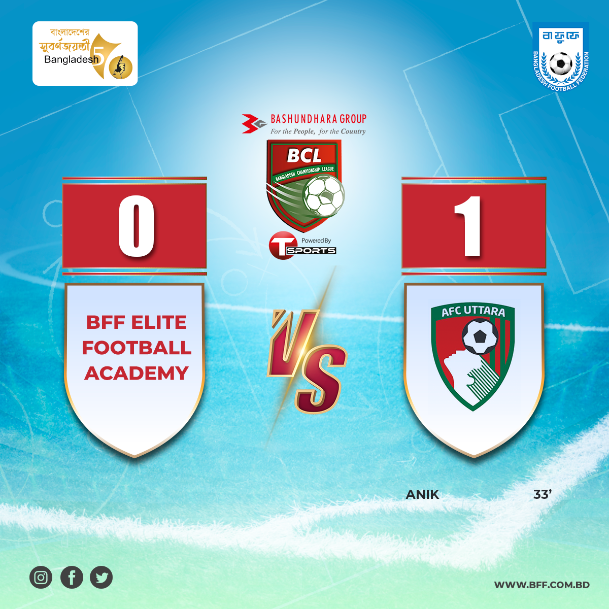 Today's match of 'Bashundhara Group Bangladesh Championship League 2021-22' was held between BFF Elite Football Academy Team Vs Azampur Football Club Uttara. Azampur Football Club Uttara won the match by 1-0 goal. For Azampur Football Club Uttara, Anik scored the only goal of the match in the 33rd minute.