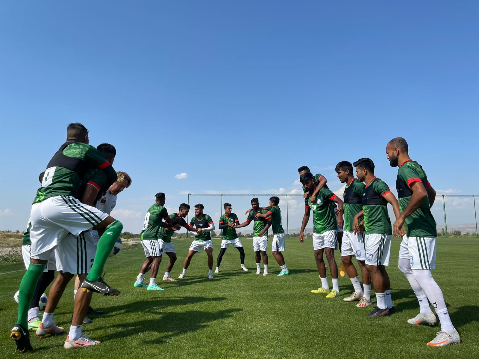 Bangladesh national football team is currently in Kyrgyzstan to participate in the 'Three Nations Cup 2021' along with Palestine and Kyrgyzstan national football team in the FIFA window of September 2021. The Bangladesh national football team has completed the practice at Sports City Field on August 29, 2021 from 3.00 pm to 4.30 pm Bangladesh time. The players of the Bangladesh national football team are in good health. Today, on 29 August 2021, goalkeeper coach Les Cleverley (England) from England joined the Bangladesh national football team. Besides, two emmigrant players Naib Md. Tahmid Islam and Md. Rahbar Waheed Khan from France and Canada respectively are scheduled to join at midnight on August 29, 2021. Tomorrow, August 30, 2021, Bangladesh national football team will conduct practice activities at the same venue from 10 am to 10.30 am and 3.00 pm to 4.30 pm Bangladesh time.