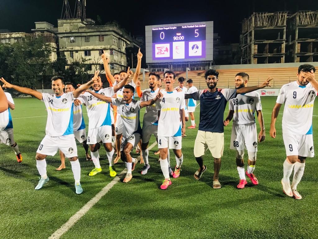 Today's match of 'Bashundhara Group Bangladesh Championship League 2021-22' was held between Kawran Bazar Progoti Songho Vs Fortis Football Club Ltd.. Fortis Football Club Ltd. won the match by 5-0 goal. For Fortis Football Club Ltd., Hasnuzzaman scored the first goal in the 15th minute, the forth goal in the 46th minute and the fifth goal in the 56th minute, Ziku scored the second goal in the 20th minute and Borhan scored the third goal in the 40th minute.
