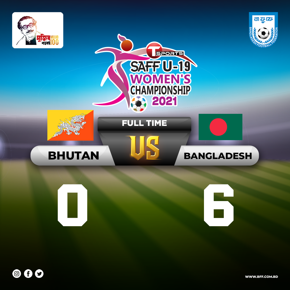 'SAFF U-19 Women's Championship 2021' between Bangladesh U-19 Women's Football Team vs Bhutan U-19 Women's Football Team match was held today at 3:00 pm at Bir Shreshtha Shaheed Sepahi Mohammad Mostafa Kamal Stadium in Kamalapur. Bangladesh U-19 women's football team won the match by 6-0 goals. Shahada akher ripa and Tohura khatun scored two goals each for Bangladesh U-19 women's football team. Ritu porna chakma and Maria manda scored one goal each in the match.