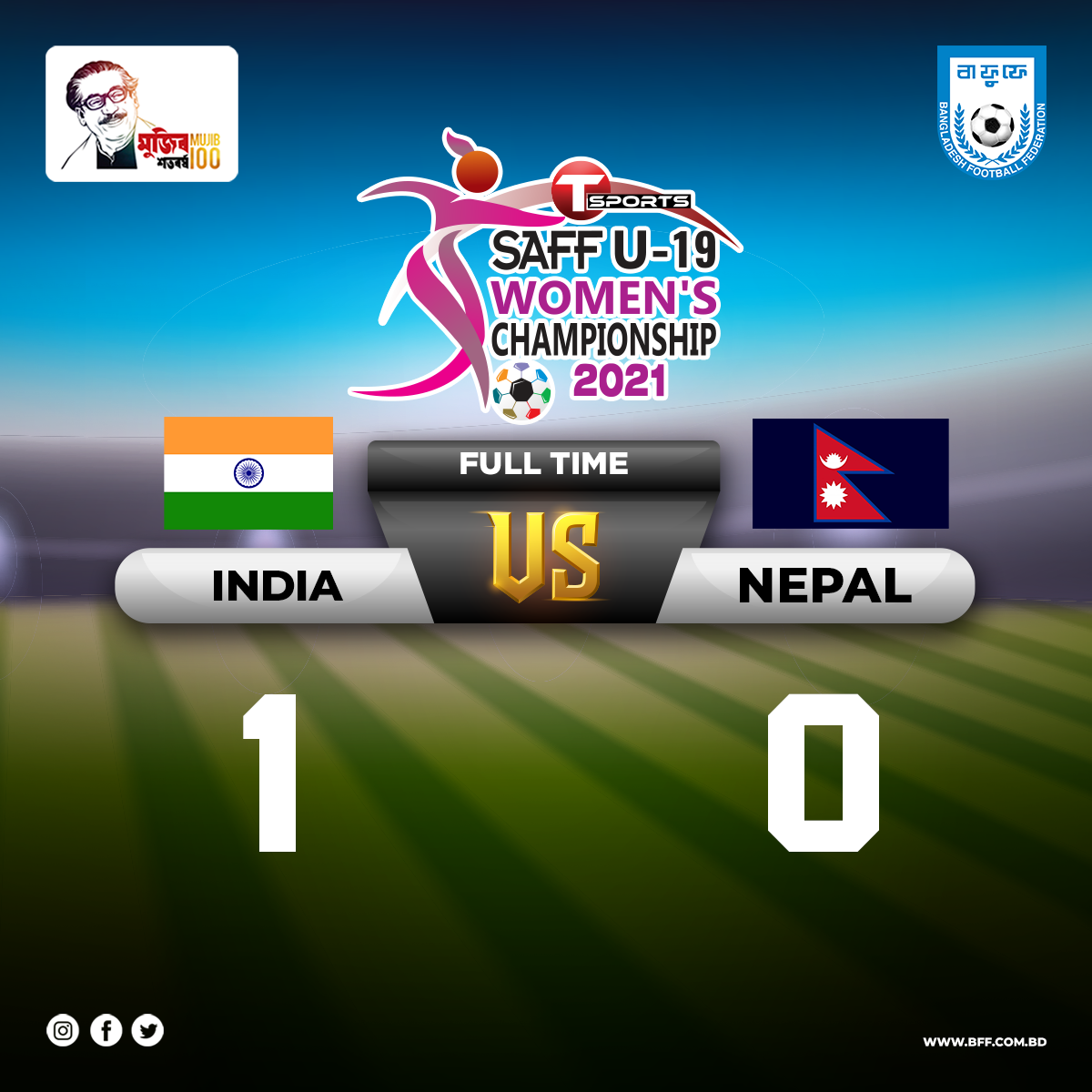 'SAFF U-19 Women's Championship 2021' between India U-19 women's football team vs Nepal U-19 women's football team match was held today at 3:00 pm at Bir Shreshtha Shaheed Sepahi Mohammad Mostafa Kamal Stadium in Kamalapur. India U-19 women's football team won the match by 1-0 goals.
