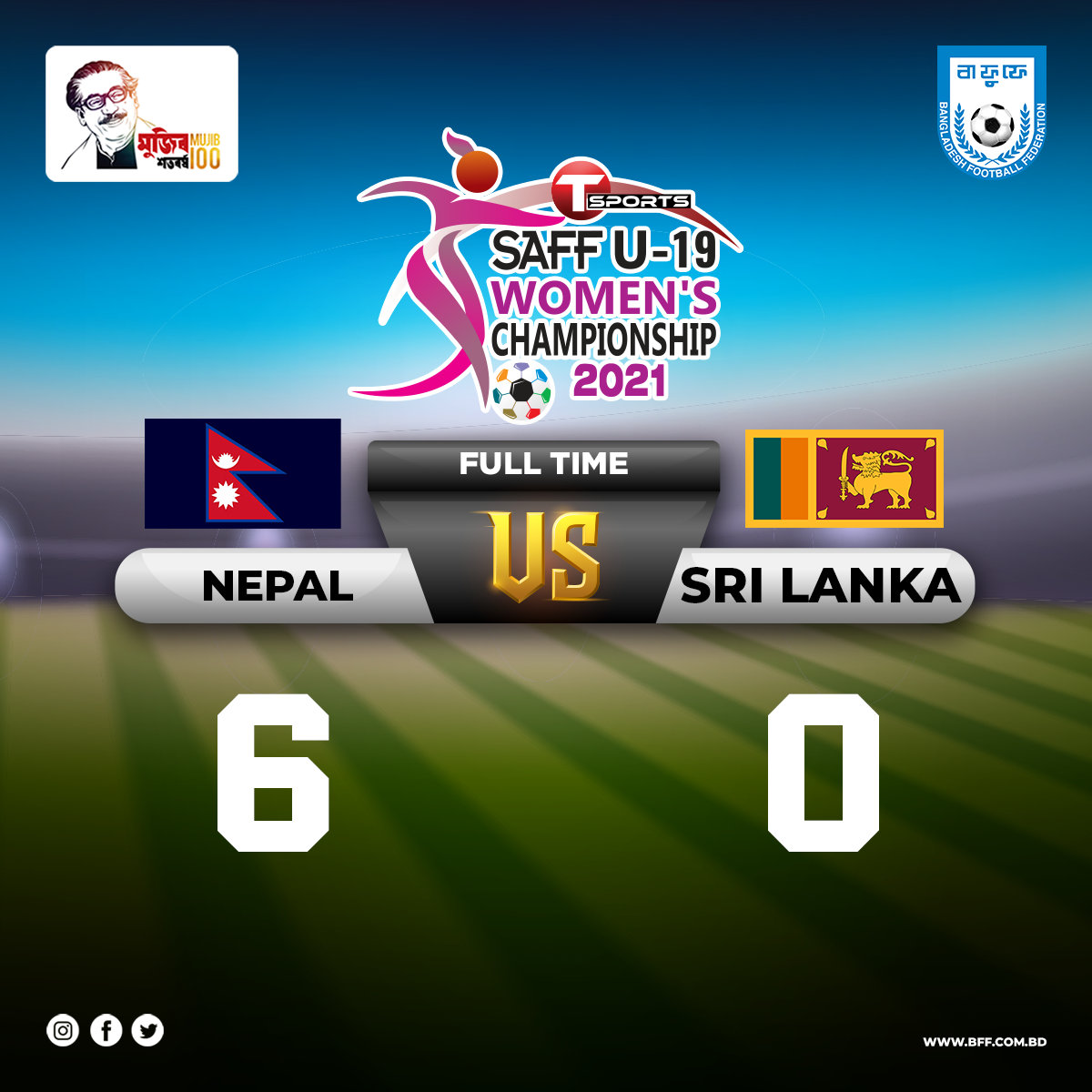 'SAFF U-19 Women's Championship 2021' between Sri Lanka U-19 women's football team vs Nepal U-19 women's football team match was held today at 3:00 pm at Bir Shreshtha Shaheed Sepahi Mohammad Mostafa Kamal Stadium in Kamalapur. Nepal U-19 women's football team won the match by 6-0 goals.