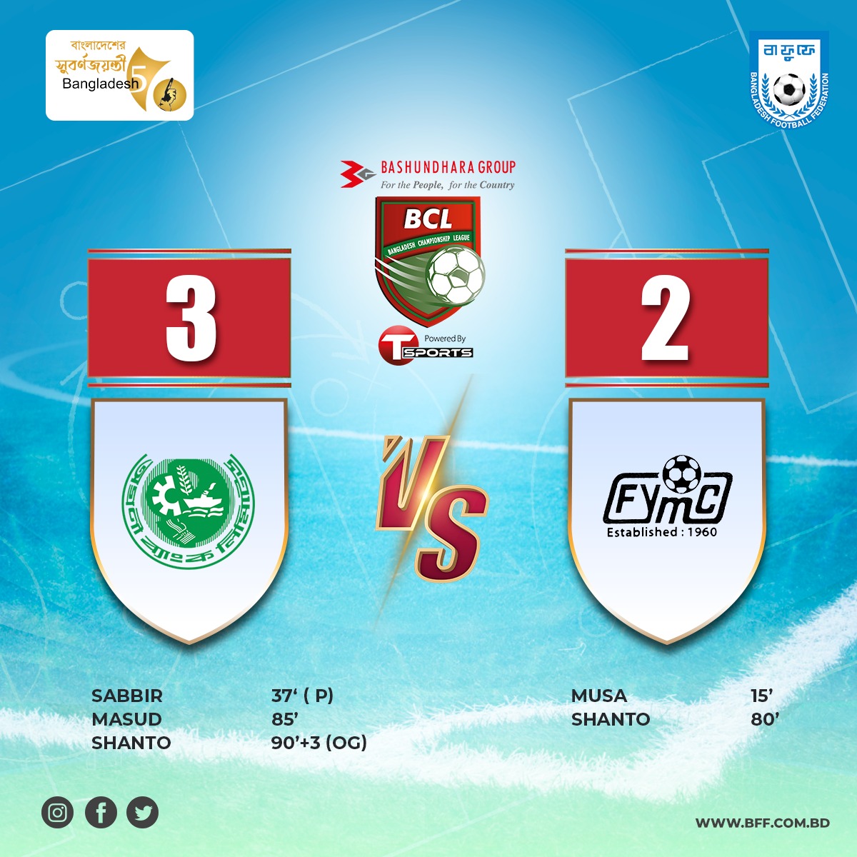 Today's first match of 'Bashundhara Group Bangladesh Championship League 2021-22' was held between Agrani Bank Ltd. Sporting Club vs Fakirerpool Young Men's Club. Agrani Bank Ltd. Sporting Club won the match by 3-2 goal. For Agrani Bank Ltd. Sporting Club, Sabbir scored the first goal from penalty in the 37th minute, Masud scored the second goal in the 85th minute and Shannto of Fakirerpool Young Mens Club scored own goal in the 90+3 minute. For Fakirerpool Young Mens Club, Musa scored the first goal in the 63rd minute and Shanto scored the second goal in the 80th minute