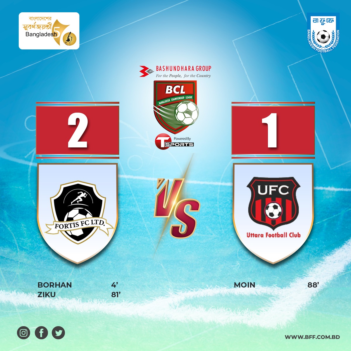 Today's first match of 'Bashundhara Group Bangladesh Championship League 2021-22' was held between Fortis Football Club Ltd. Vs Uttara Football Club Ltd.. Fortis Football Club Ltd. won the match by 2-1 goal. For Fortis Football Club Ltd., Borhan scored the first goal in the 4th minute and Ziku scored the second goal in the 81st minute. For Uttara Football Club Ltd., Moin scored the only goal in the 88th minute. Sujon of Uttara Football Club Ltd. had to leave the field after getting the direct red card.