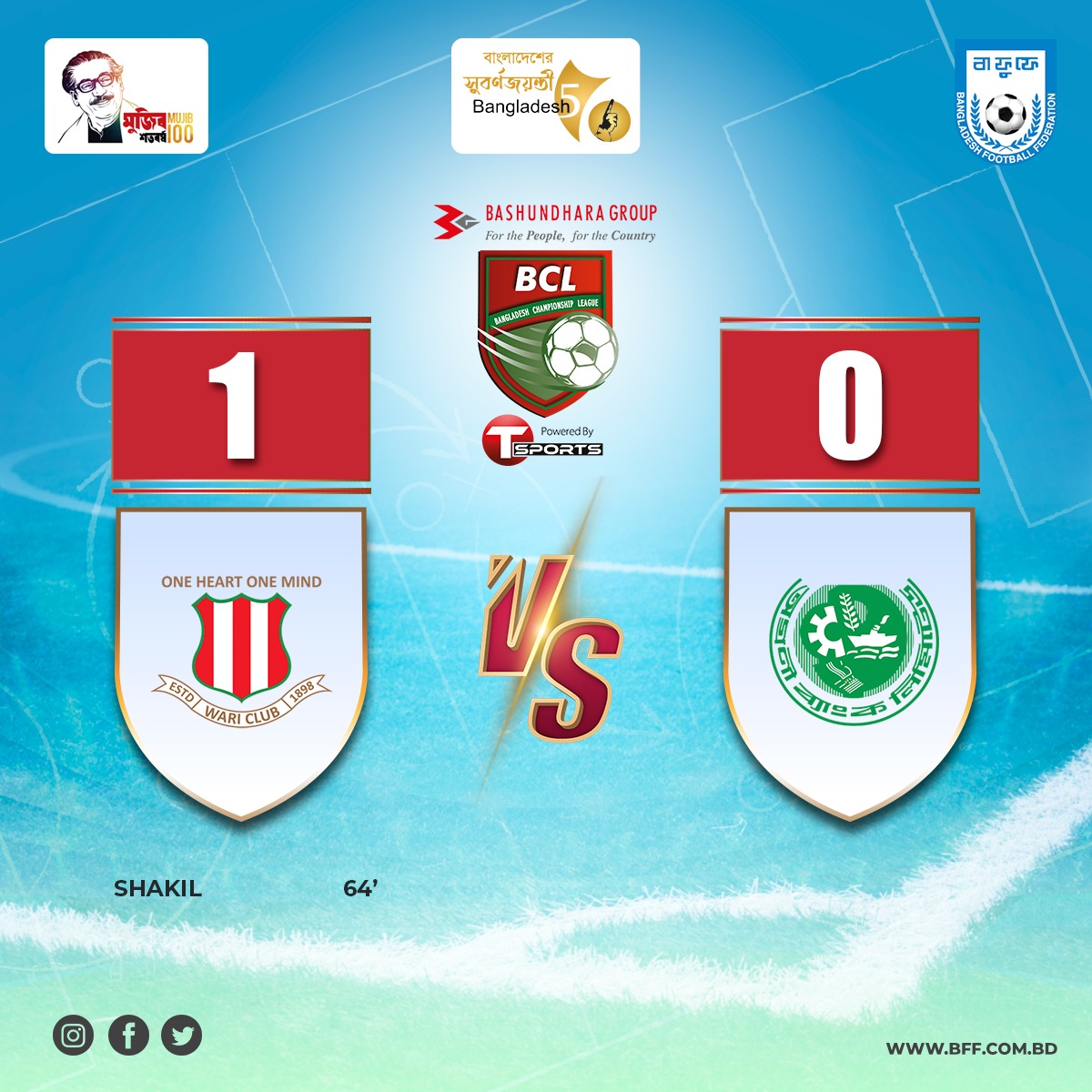 Today's match of 'Bashundhara Group Bangladesh Championship League 2021-22' was held between Wari Club vs Agrani Bank Ltd. Sporting Club. Wari Club won the match by 1-0 goal. For Wari Club, Shakil scored the only goal of the match in the 64 minute.