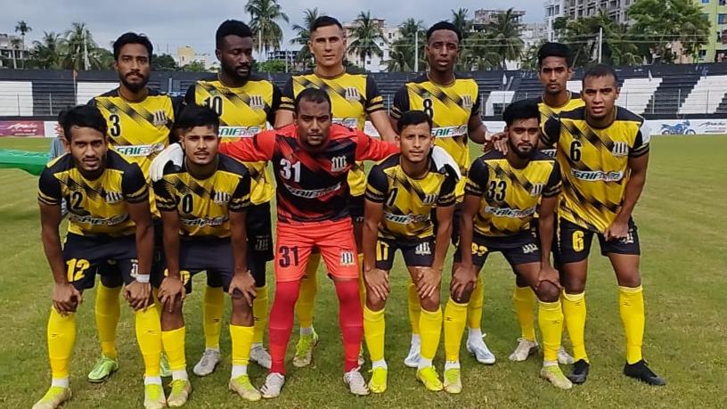 Today's match of 'TVS Bangladesh Premier League 2021-22' was held between Chittagong Abahoni Ltd. Vs Saif Sporting Club Ltd.. Saif Sporting Club Ltd. won the match by 4-3 goal. For Saif Sporting Club Ltd., Emeka scored the first goal in the 43rd minute, Fahim the second goal in the 72nd minute & the third goal in the 74th minute and Bayisenge scored the forth goal in the 90+1 minute. For Chittagong Abahoni Ltd., Popalzay scored the first goal in the 57th minute, Augustine scored the second in the 65th minute and Thankgod scored the third goal in the 87th minute.