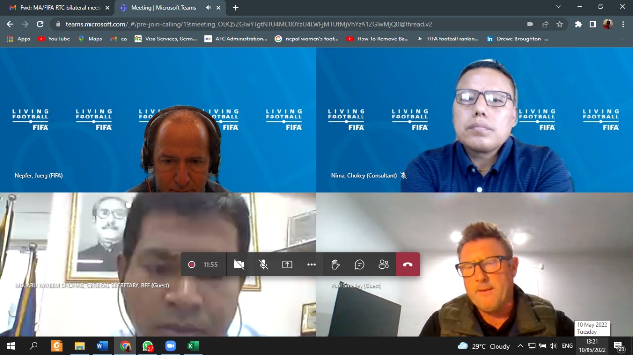 The Technical Department of Bangladesh Football Federation attended a formal meeting with FIFA. The digital meeting involved Federation's General Secretary Mr. Md Abu Nayeem Shohag, Technical Director Mr. Paul Smalley, Technical Coordinator Mr. Saeed Hasan with Mr. Chokey Nima, FIFA Regional Technical Consultant and Mr. Neifer from FIFA HQ officials. The discussion focused around reflections and the deliverables on Football activities during 2021 with the priorities for 2022.